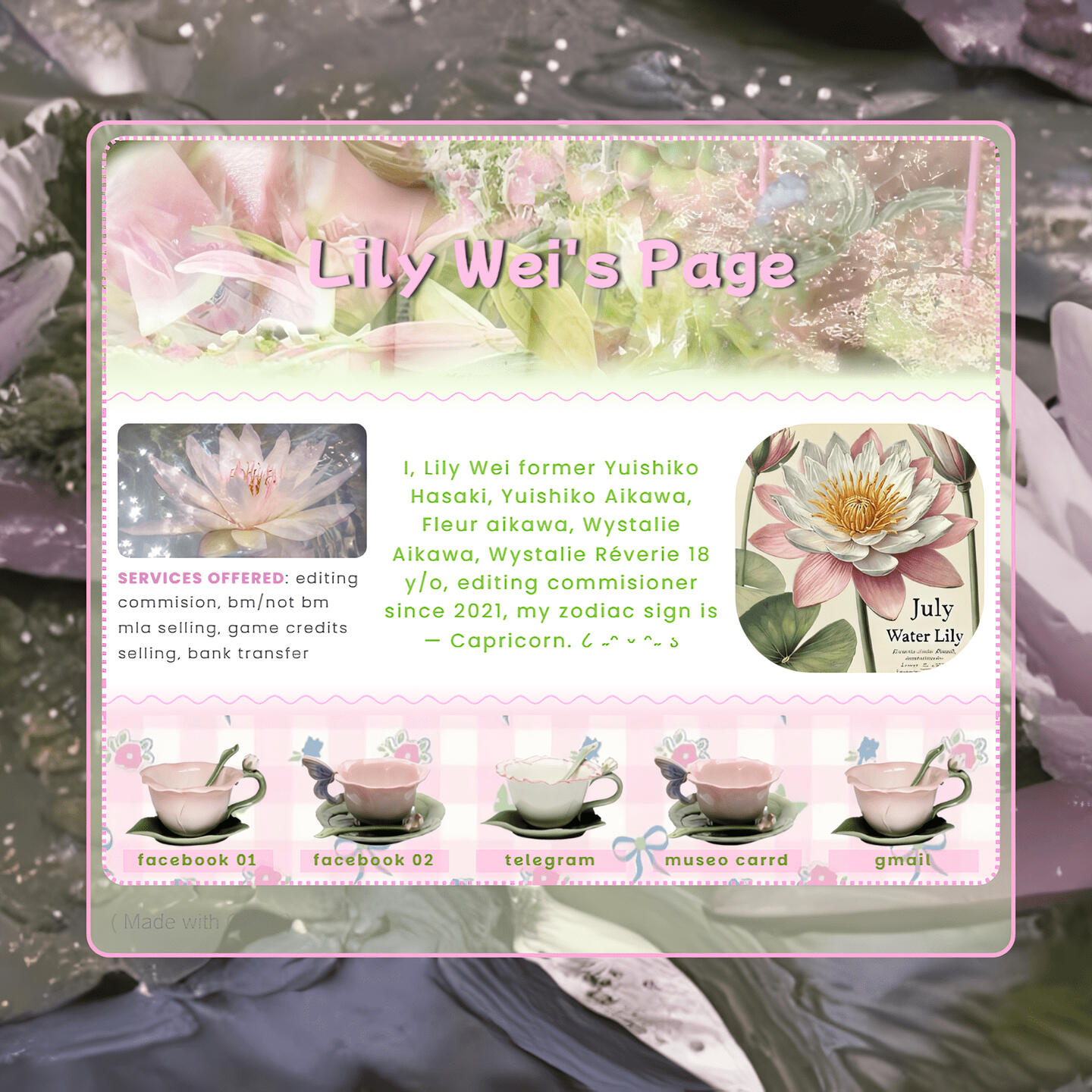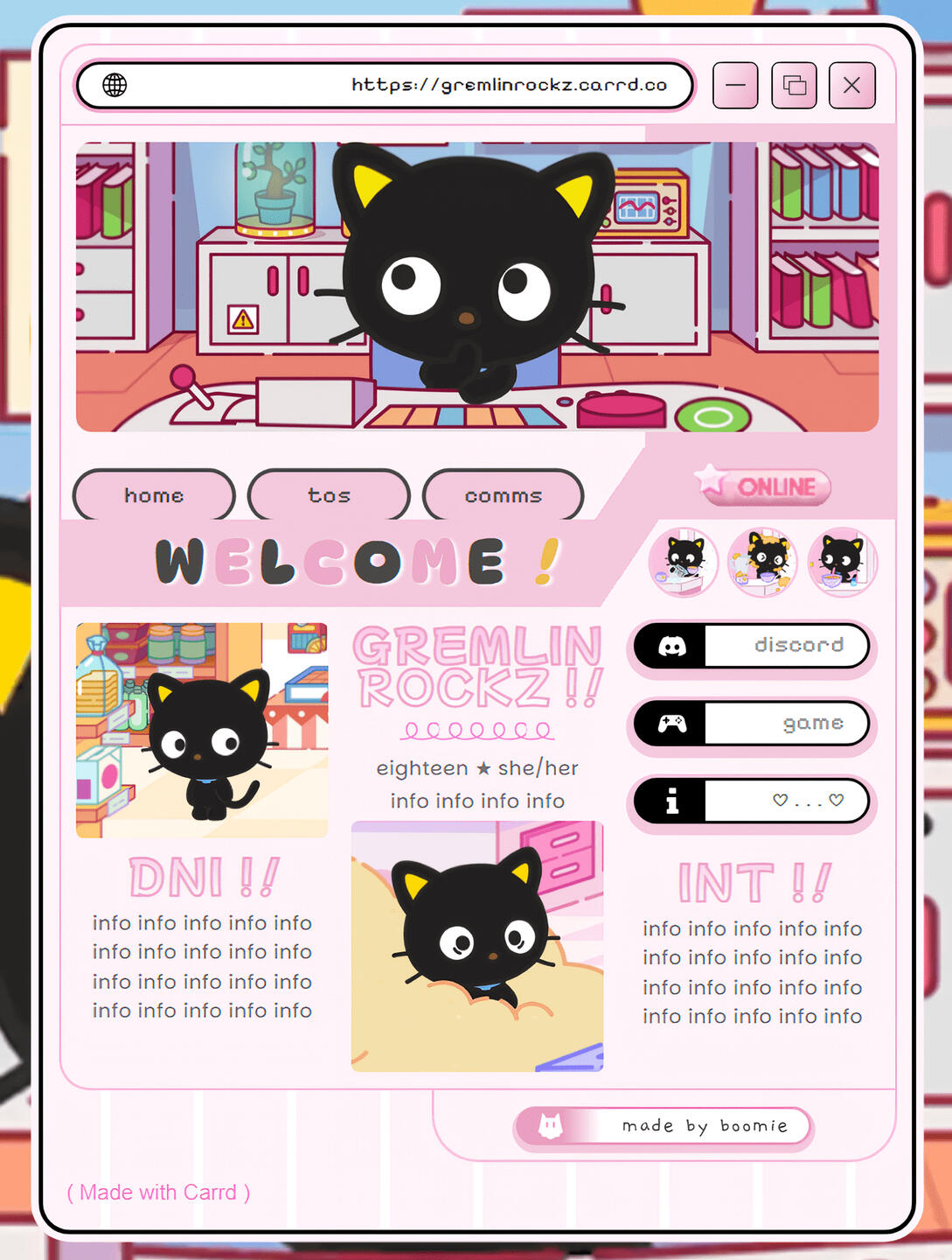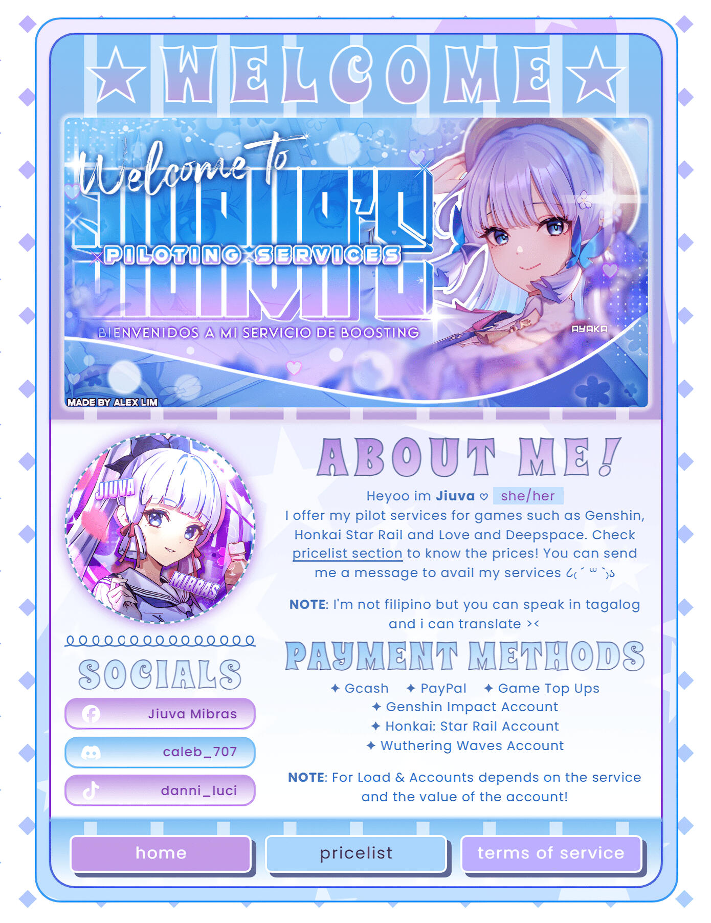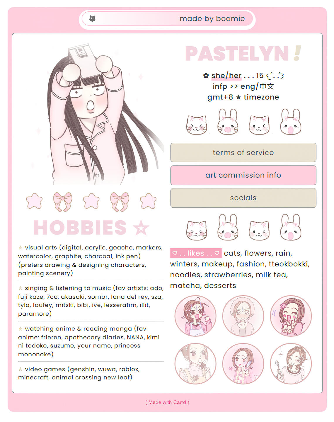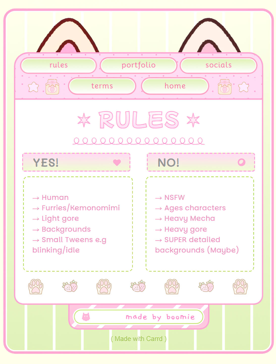 ➜ TAT> 1 - 4 days (carrd), but usually when its not too complex i finished within an hour or so ^ ^➜ PAYMENT / ACCOUNT> you can pay half or full payment.> DONT LOWBALL or MESSAGE me if you cant afford my prices.> i usually take payment after the commission, so please be aware that the price might increase depending on the changes or edit made on the carrd.> i mainly take paypal & gcash. If you want to pay through nitro or robux just ask me.> i do not do REFUNDS. unless i haven't started the carrd yet.> if there's no payment that have been made after finishing the commission, i will automatically delete the carrd after 2 days.> clients MUST HAVE THEIR OWN CARRD ACCOUNT, since i dont use pro plan. If you're not comfortable giving out your carrd info please don't message me.> i don't usually put watermarks on the carrds i make, but when i do, please don't remove them!