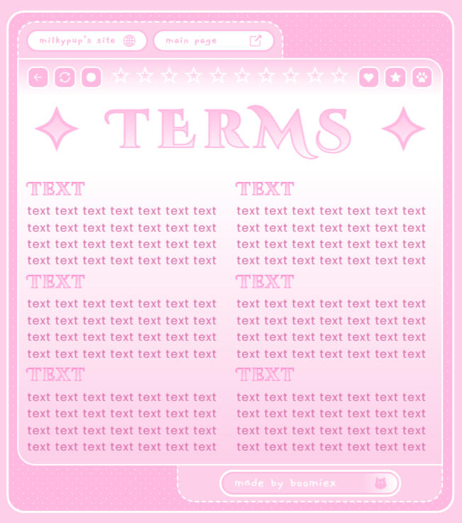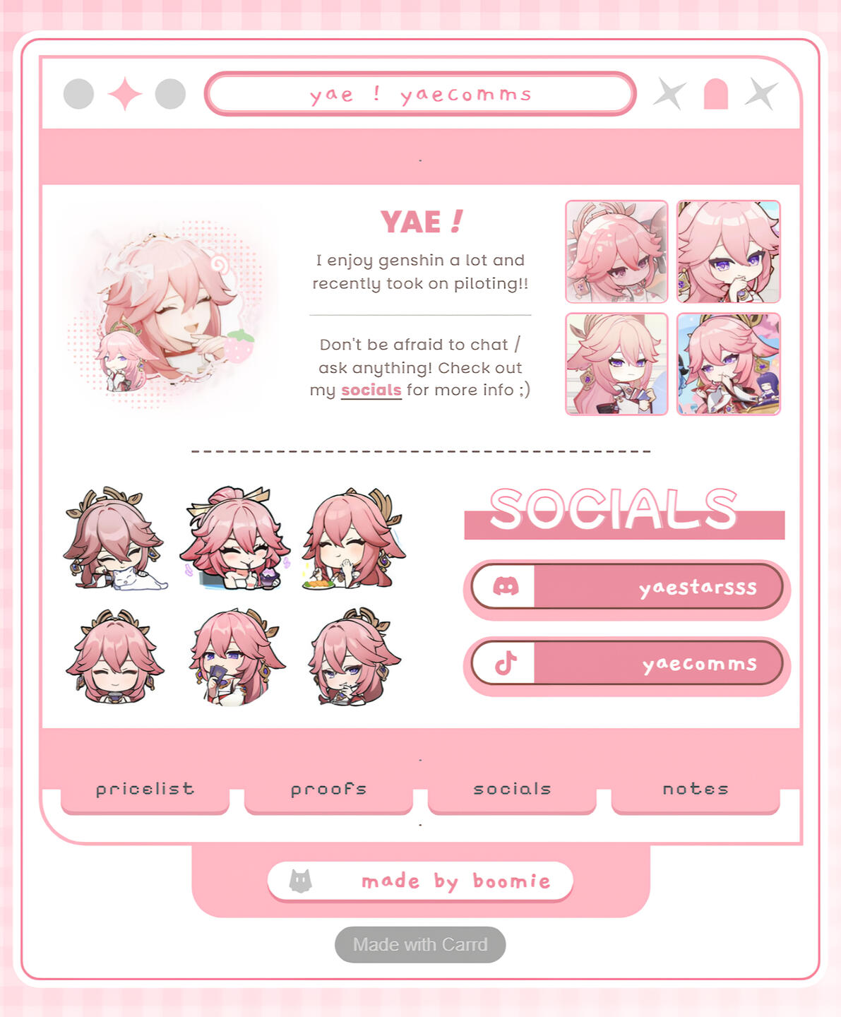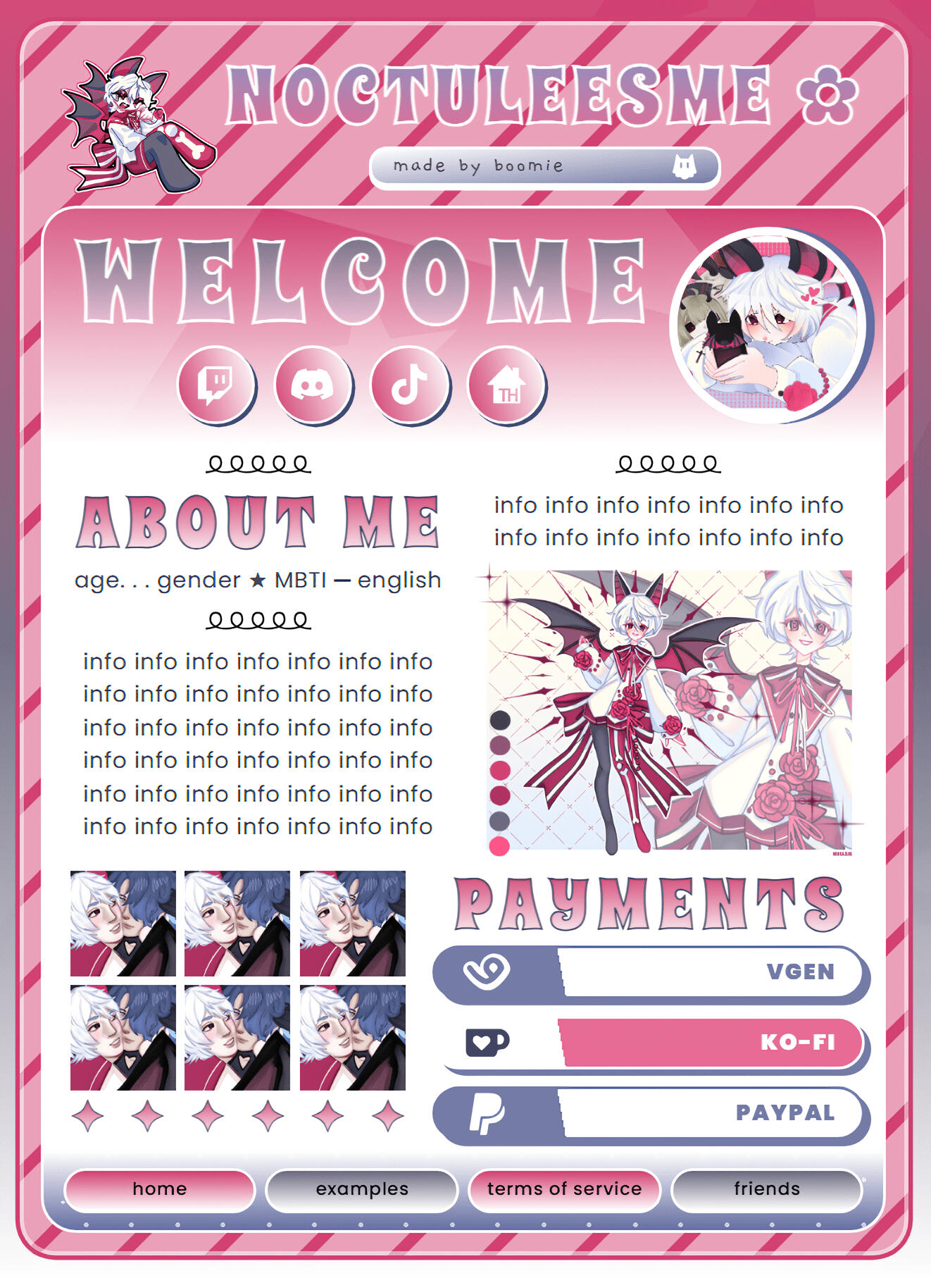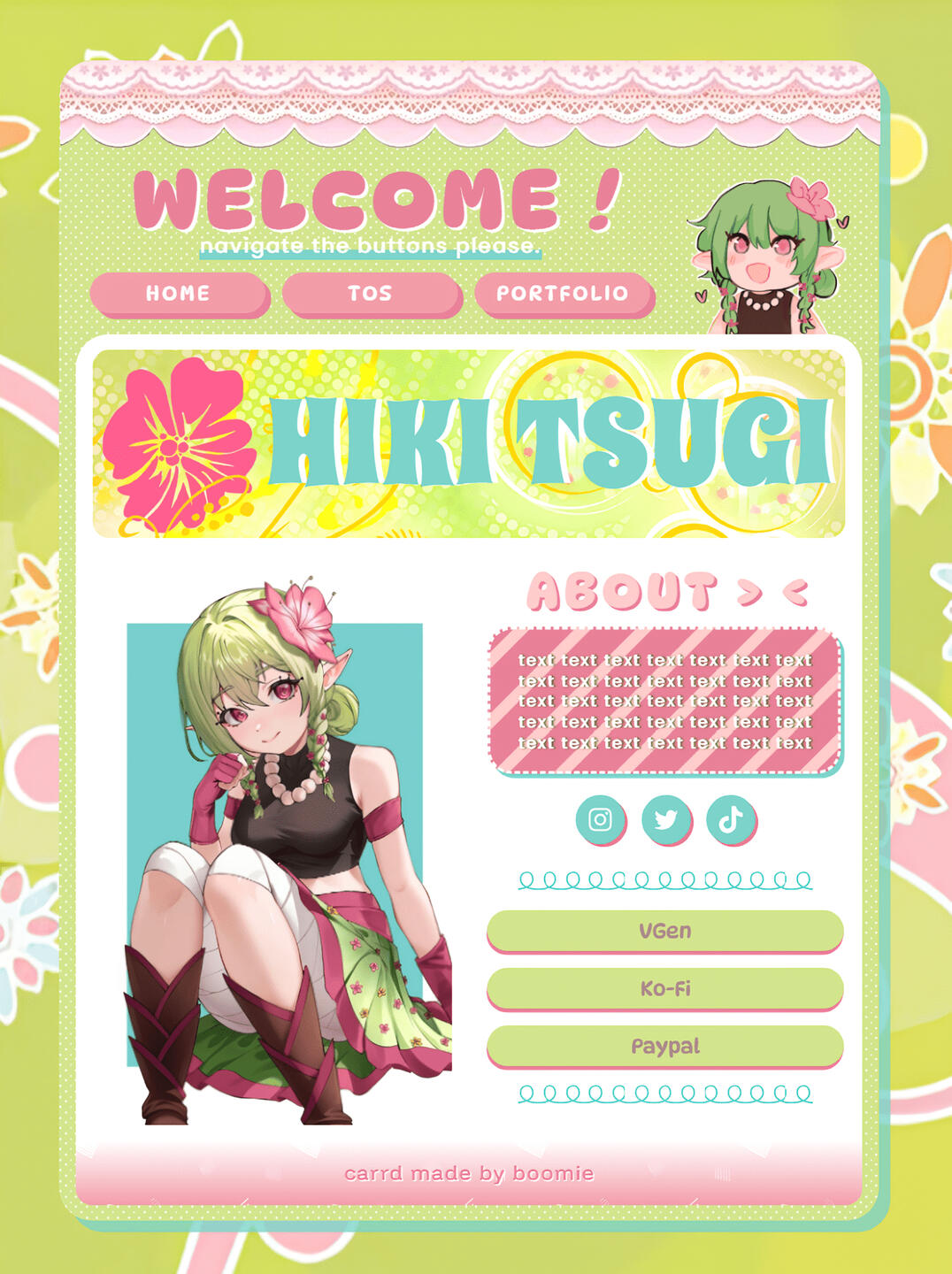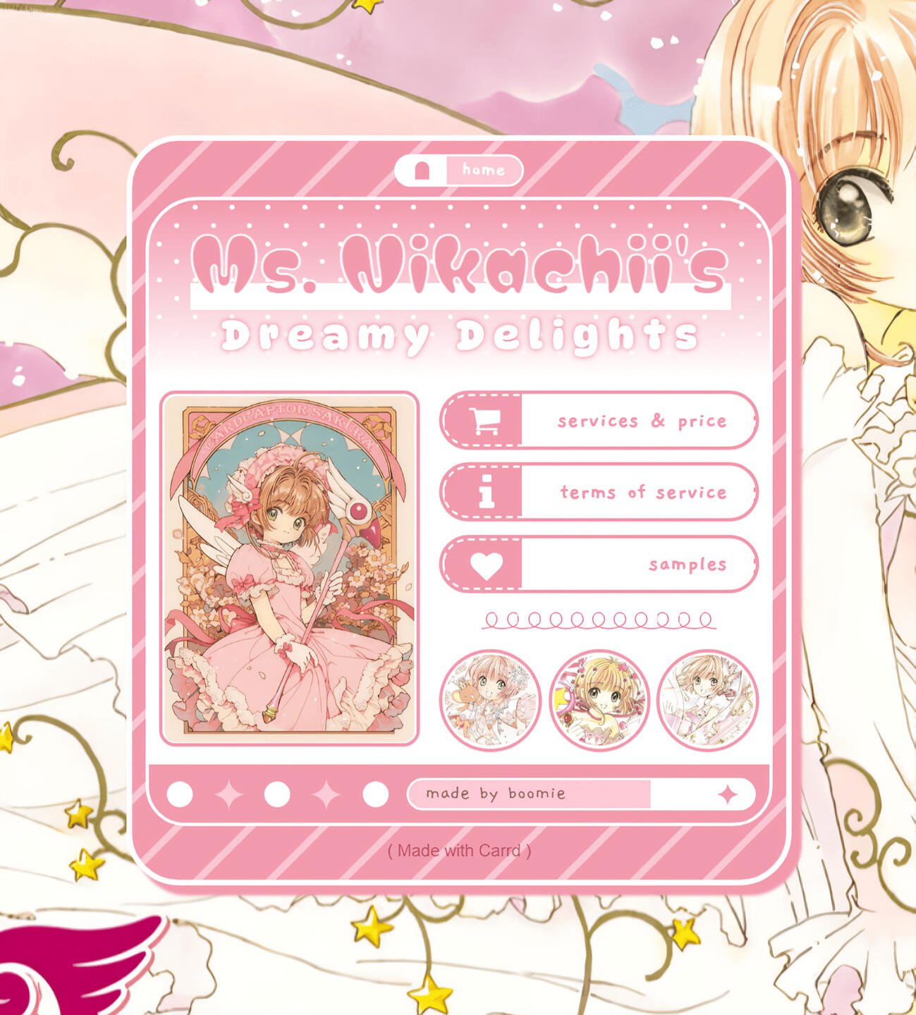 ➜ uhm> if you're commissioning me that means you agreed and abide with my rules and terms.➜ LAYOUT / TEXTS / USAGE> please specify what will be the color palette/overall theme/layout you want for the carrd, rough sketch for the layout/outline of the carrd is much appreciated.> please send the detail/info and anything that is needed to put in the carrd all at once so that i will only focus with changes later on.> avoid being vague or unsure with the details, so that i don't have to edit a lot once im done making the carrd.> kindly state if you want me to put the texts, or you're the one who'll gonna put it, if you want me to put the texts, please kindly send the texts that will be put in the carrd all at once to avoid further delay of the commission.> i will probably use your carrd as one of my samples, so please keep that in mind.➜ REVISIONS / EXTRA